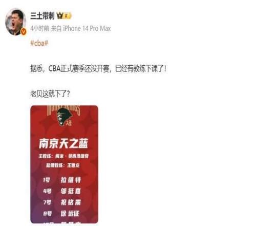 南京同曦队方面,上赛季在外籍主教练贝西诺维奇的带领下球队首次进入季后赛,不过在最近几天的CBA俱乐部杯赛中同曦队三战全败,先后输给北控男篮,NBL香港金牛队,以及宁波队,三场比赛净输30分。尤其是大比分输给CBA联赛垫底的宁波队,这让球队的管理层十分不满,也是贝帅下课的重要导火索。