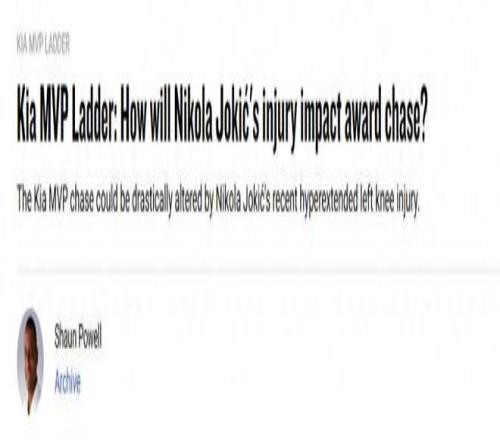 目前唯一阻碍约基奇冲击生涯第4个MVP的因素就是伤病问题,由于踩到队友脚被误伤,约基奇预计将至少缺席一个月时间。