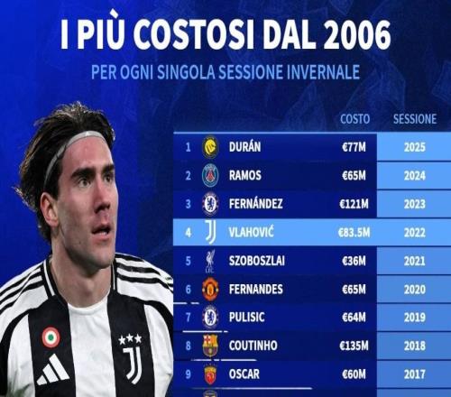 德转列06年至25年全球冬窗标王:库鸟1.35亿第1,中超两度上榜 -